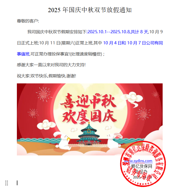 我司国庆中秋双节假期安排如下:2025.10.1--2025.10.8,共计8天,10月9日正式上班;10月11日(星期六)正常上班,其中10月4日和10月7日公司有同事值班,可正常办理投保事宜!(处理速度稍慢些) ;