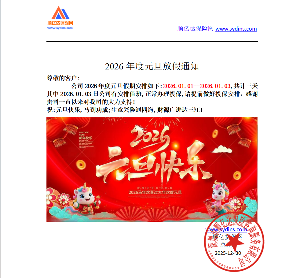 2026年度元旦放假通知 尊敬的客户: 公司2026年度元旦假期安排如下:2026.01.01--2026.01.03,共计三天其中2026.01.03日公司有安排值班,可以正常办理投保,速度稍慢些,请提前做好投保安排,,感谢贵司一直以来对我司的大力支持! 祝:元旦快乐,马到功成;生意兴隆通四海,财源广进达三江!