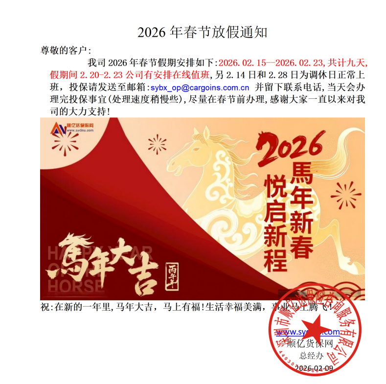 我司2026年春节假期安排如下:2026.02.15--2026.02.23,共计九天,假期间2.20-2.23公司有安排在线值班,另2.14日和2.28日为调休日正常上班,投保请发送至邮箱:sybx_op@cargoins.com.cn 并留下联系电话,当天会办理完投保事宜(处理速度稍慢些),尽量在春节前办理,感谢大家一直以来对我司的大力支持!